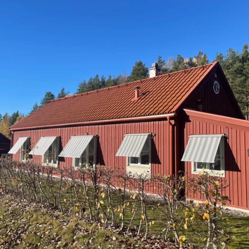 Vi installerade fönstermarkiser i modellen Hestra Tage, utrustade med motor från Becker. Med fjärrkontroll styrs markiserna enkelt in och ut med ett knapptryck, utan vev eller ansträngning. För att passa husets röda fasad och tak valdes en vit- och gråmönstrad väv från Sandatex, som lyfte hela exteriören med ett fräscht och exklusivt uttryck.